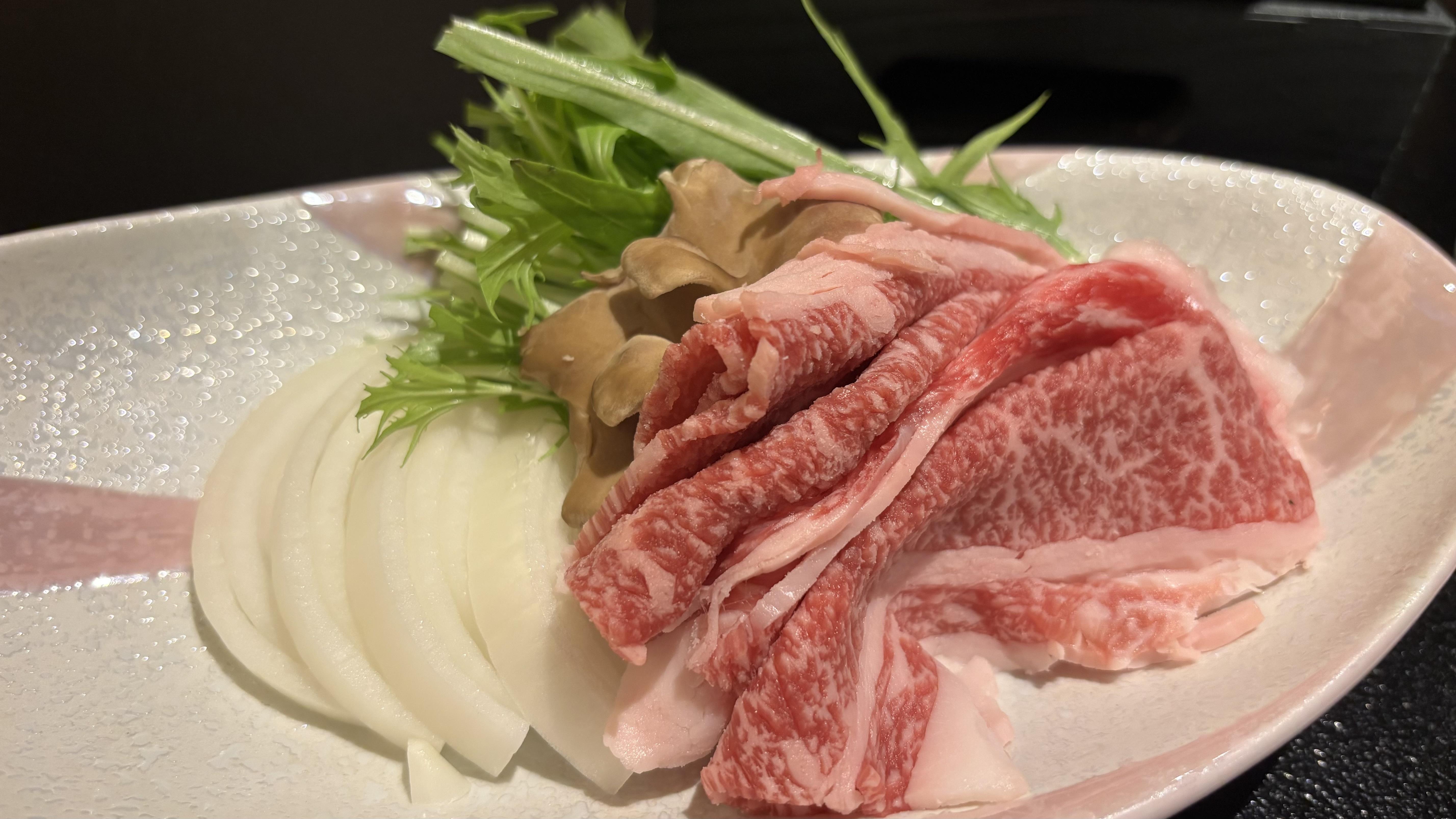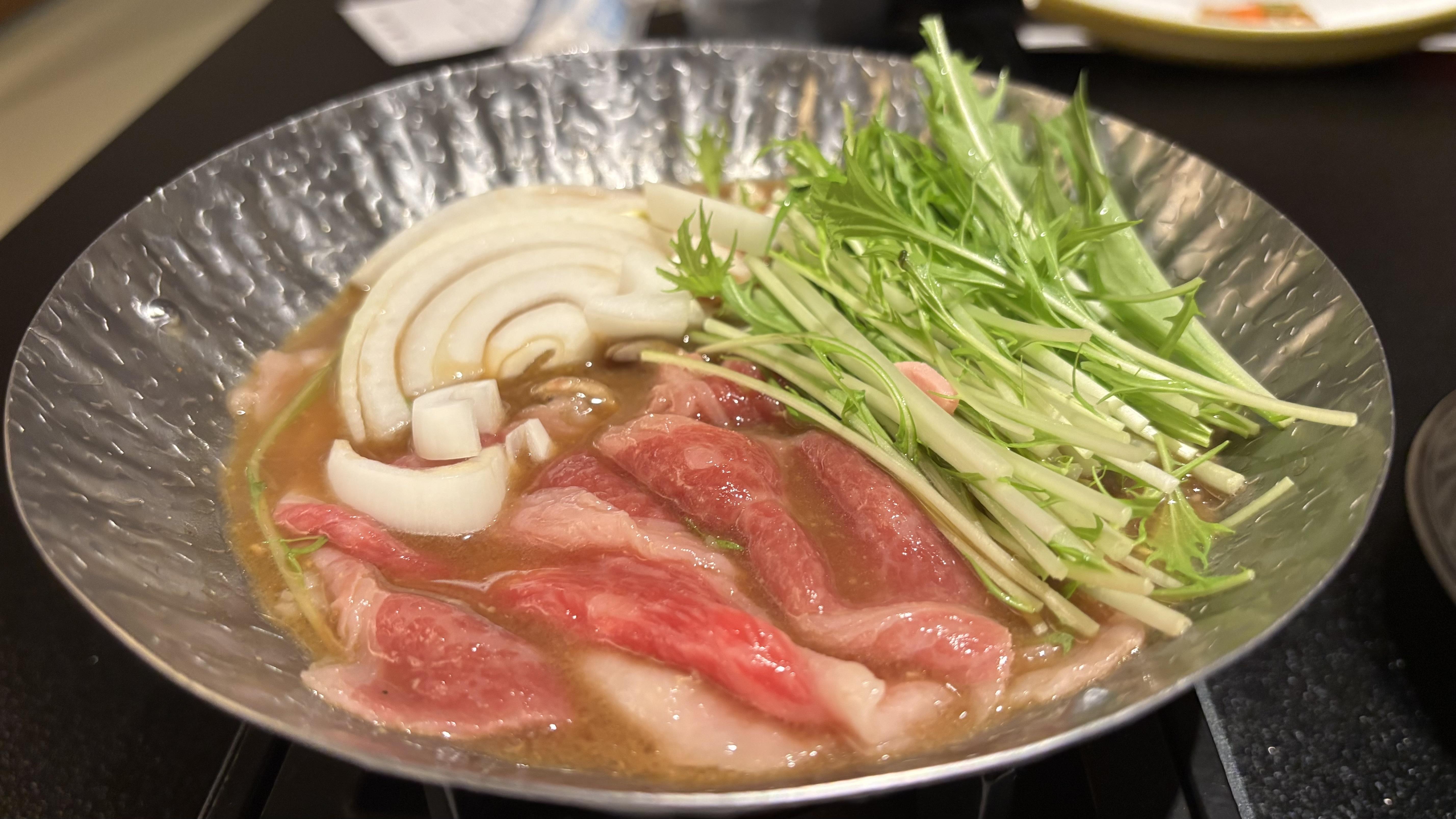 黒毛和牛と玉ねぎ、水菜、きのこを、お味噌出汁の中で煮るお鍋。