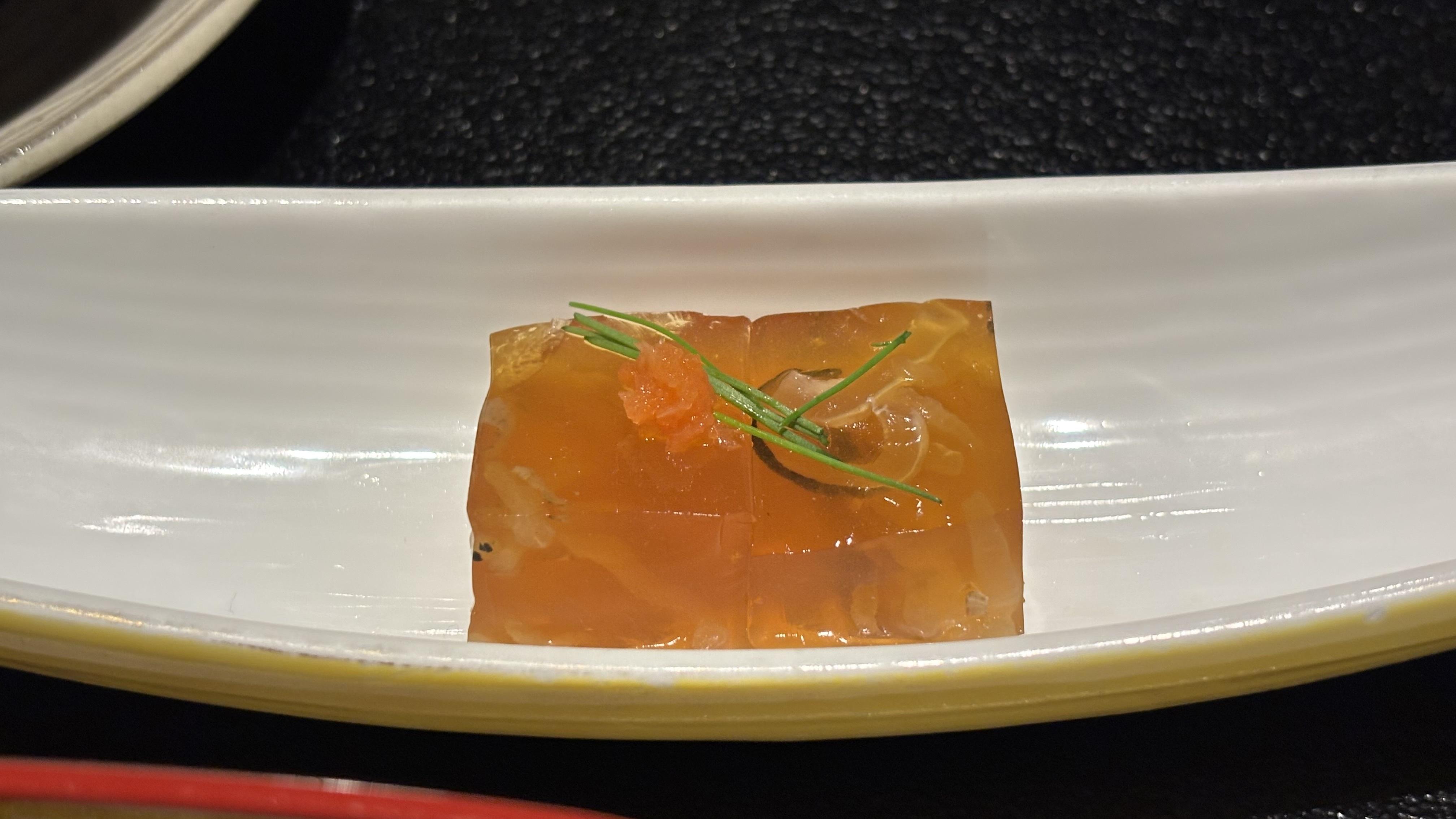 河豚の皮を、ポン酢のような味のゼリーで固めた感じ。
