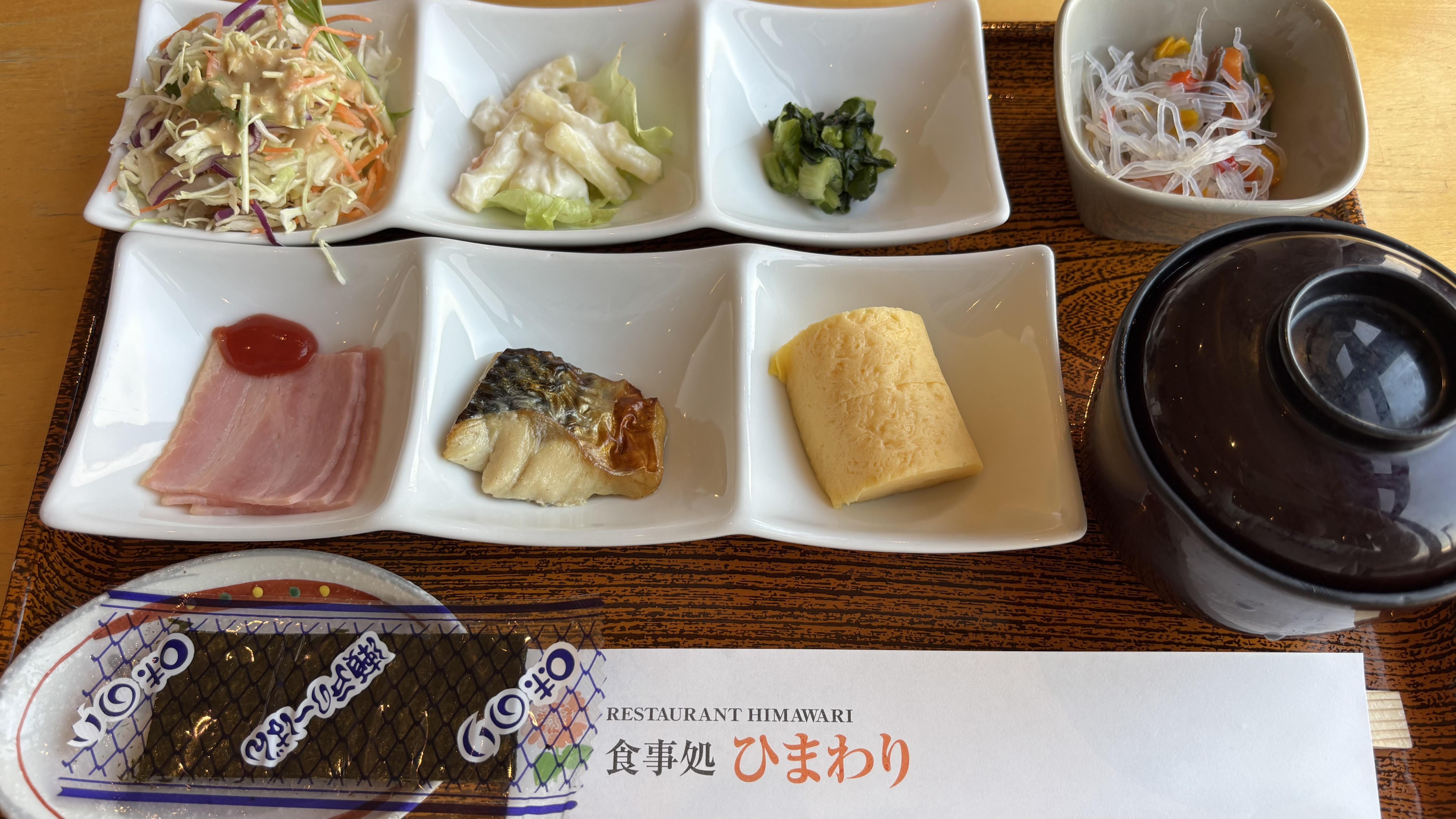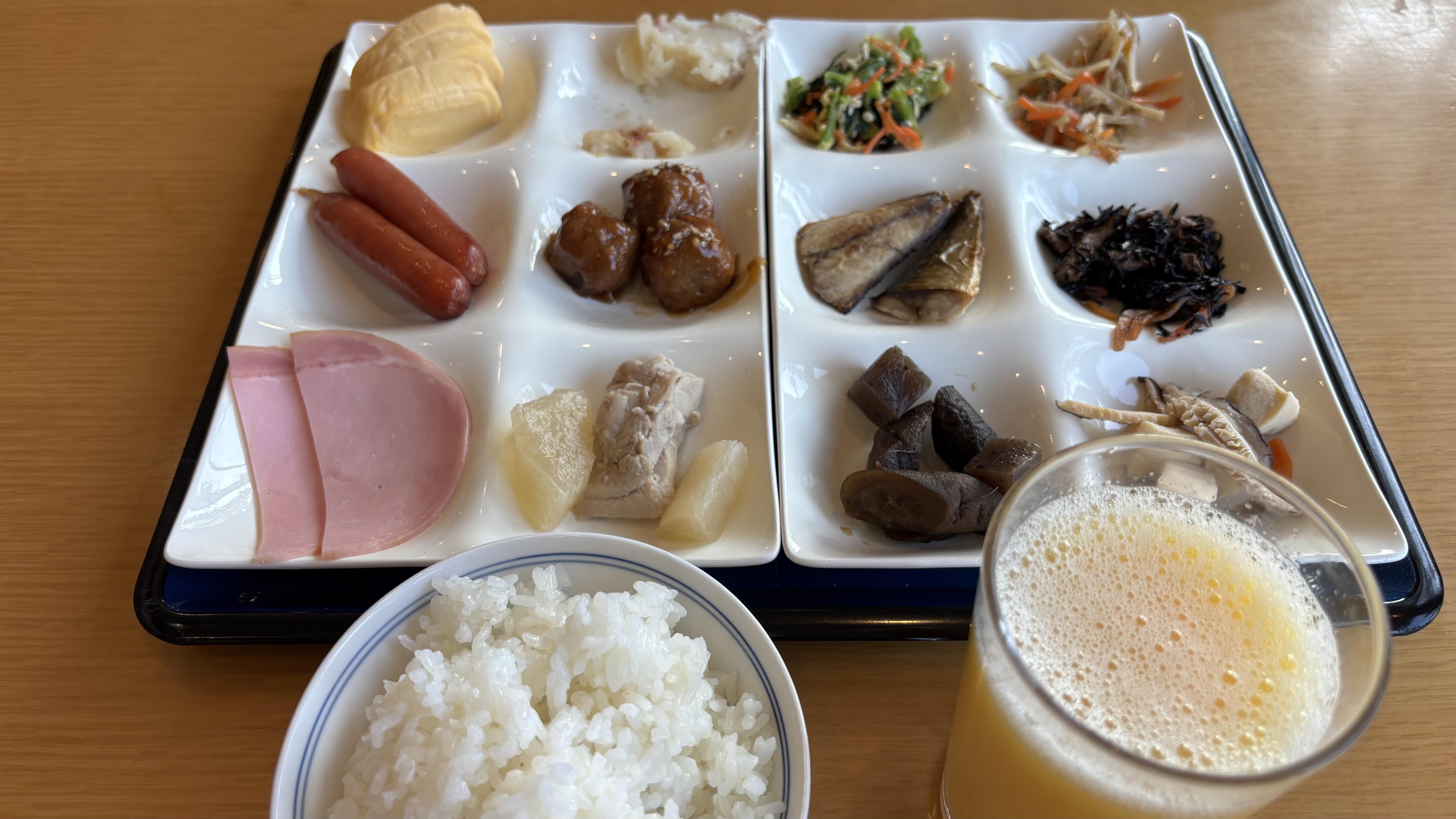 朝食は、ご飯と飲み物がセルフサービスで、おかずとお味噌汁は配膳されるスタイルでした。