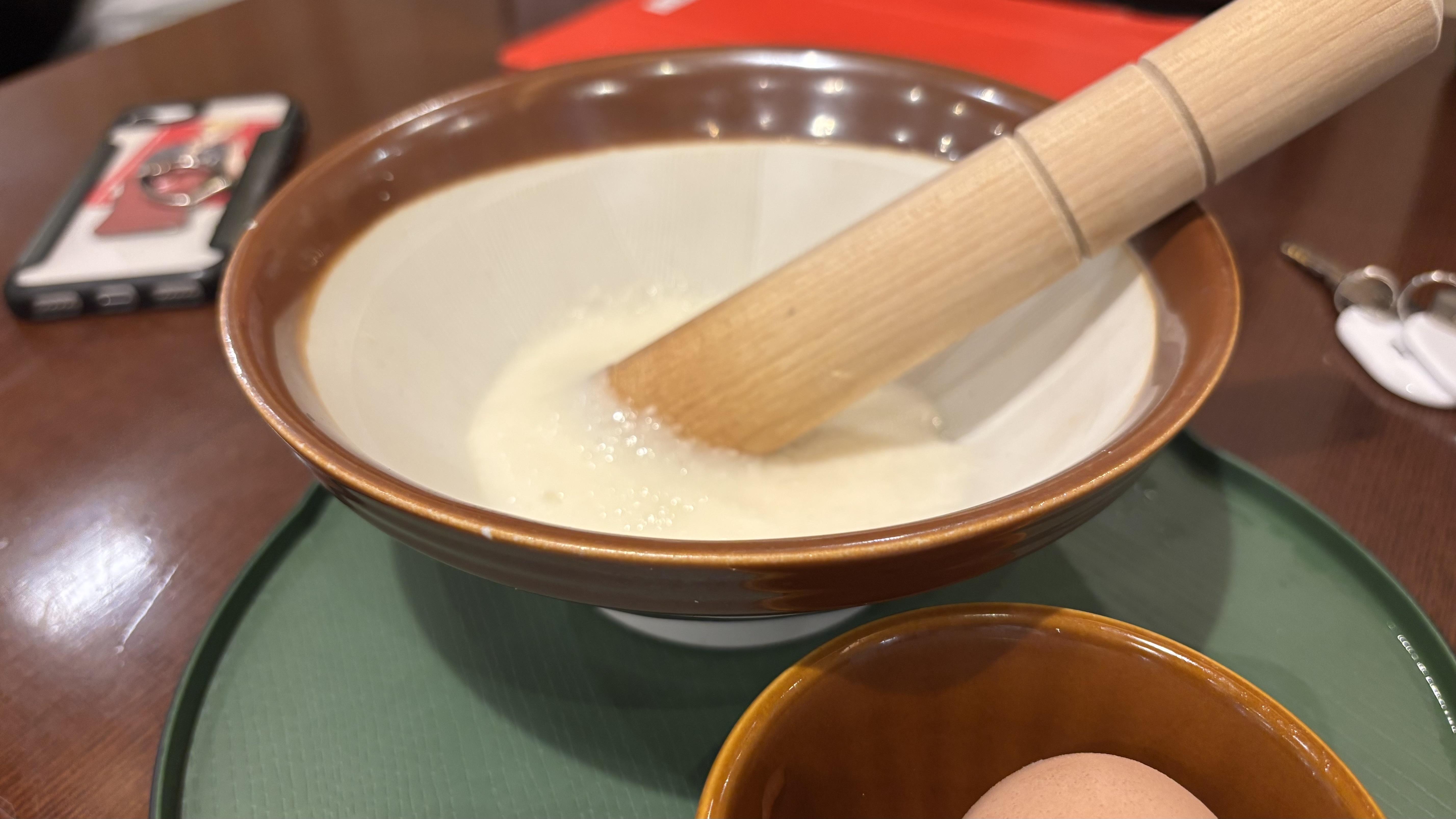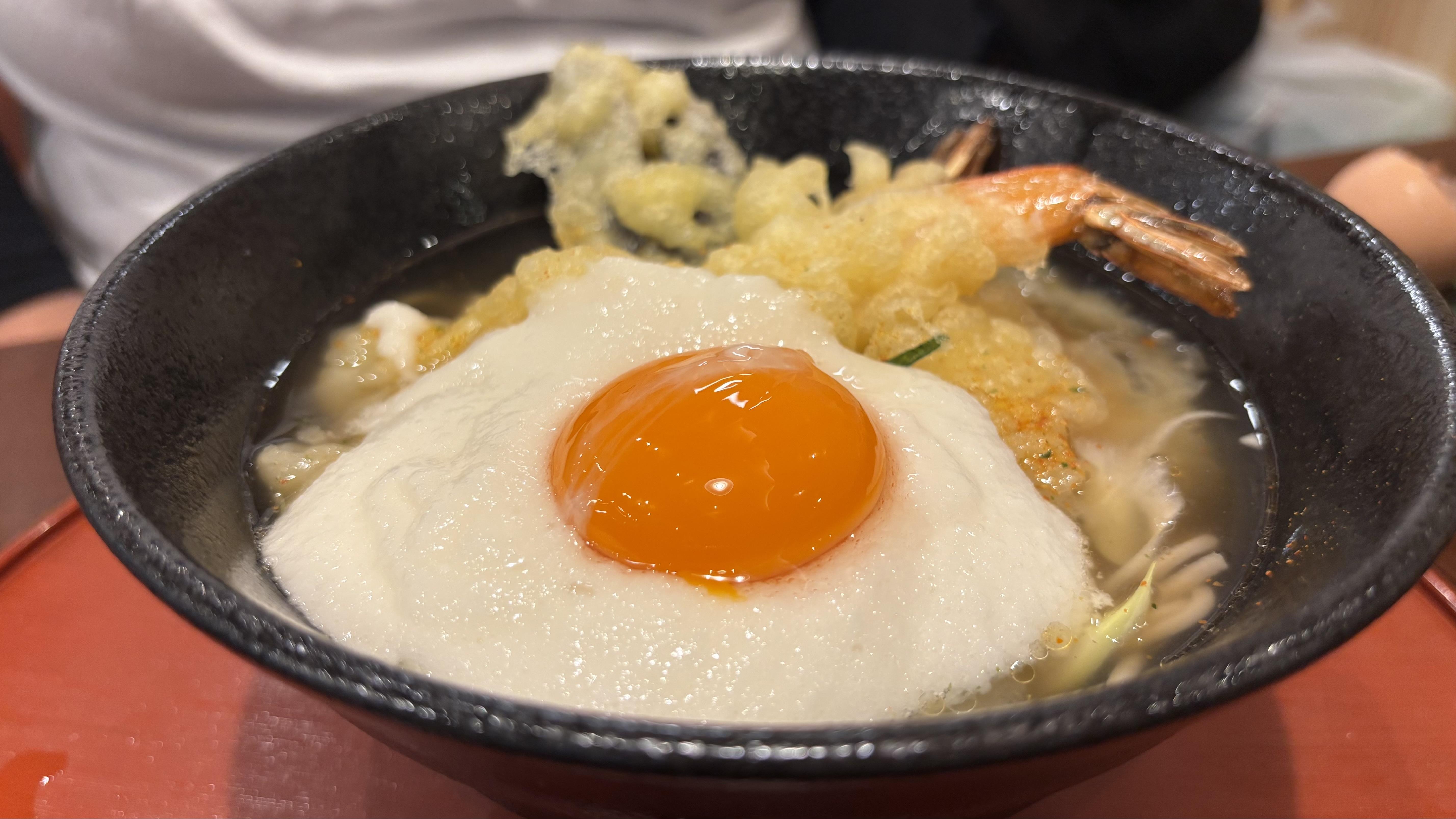 妻の人は、天ぷらそばに単品のとろろを追加して、山掛け天ぷら月見そばに。
