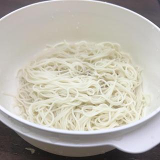 今日は、ダイソーのレンチンパスタ容器で素麺にチャレンジしました。