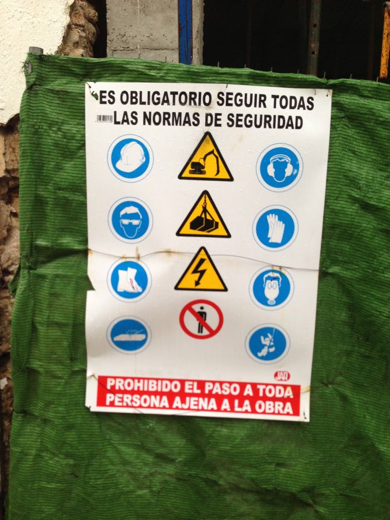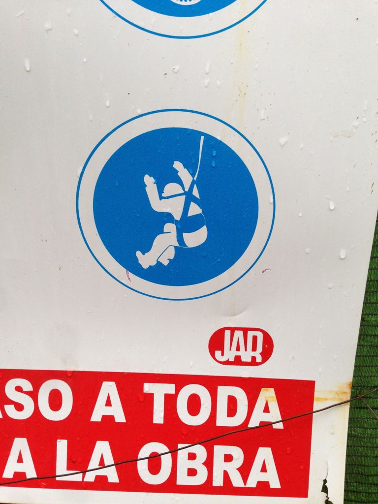 その橋を、ややしたから見上げられるスポットへ行く道の脇に、工事現場あり。日本でもよくある看板なんだけど・・・